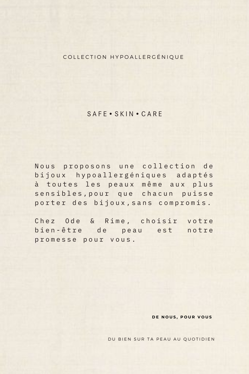Creada en 2021 y ubicada en París, Ode & Rime es una marca francesa comprometida con la colección de joyas hipoalergénicas diseñadas para el bienestar de tu piel y que adopta una moda ética y eco-responsable. Diseñadas para ser hipoalergénicas, nuestras joyas ofrecen comodidad y bienestar a la piel. Prestamos especial atención a la resistencia y durabilidad de nuestro acero para una gestión responsable de los recursos. Colaboramos con diseñadores y socios de joyería franceses y europeos, de acuerdo con nuestros valores: SKIN•SAFE•CARE